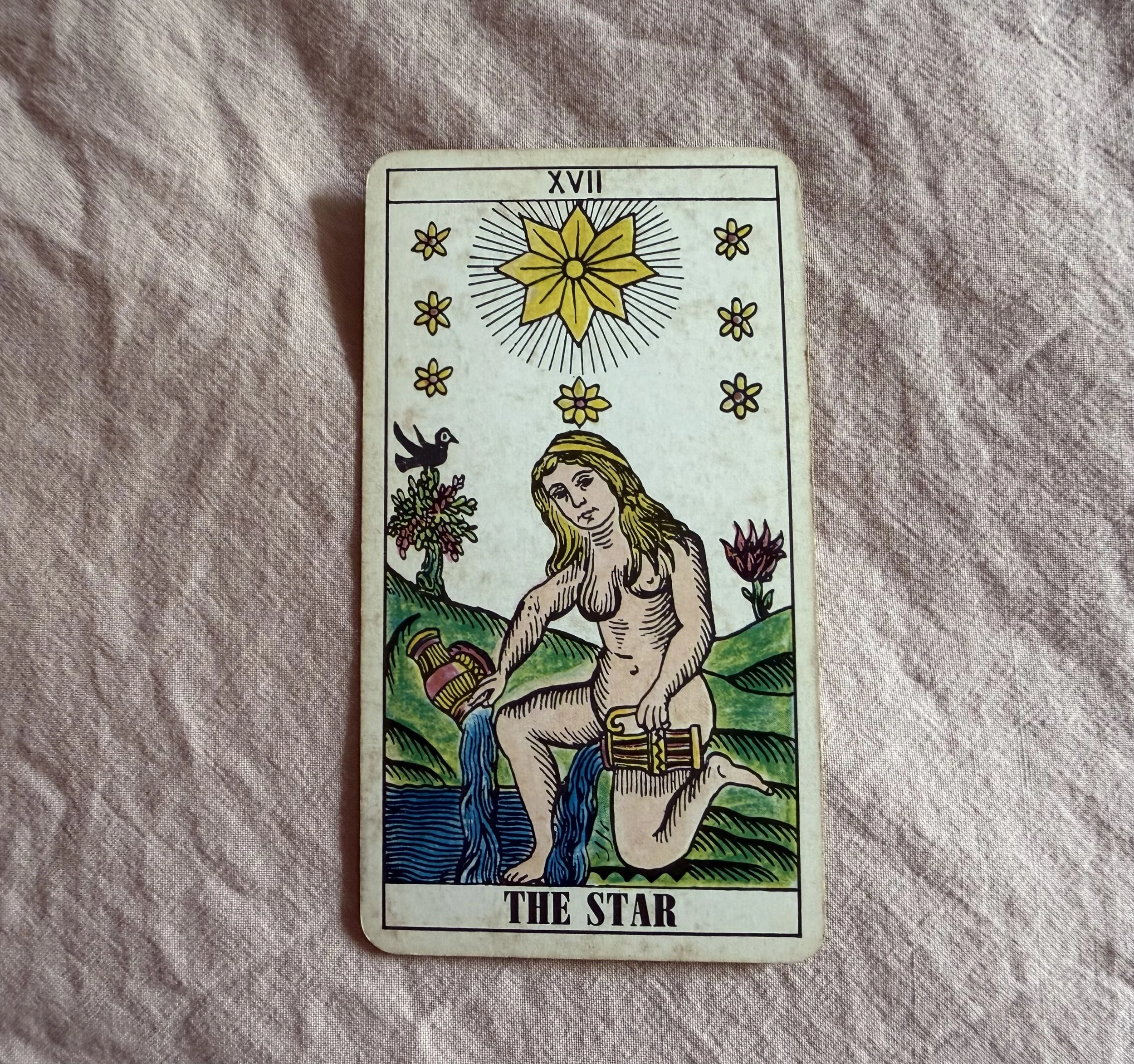 Another deeply feminine card pull from Sian for this year- the woman in the star is naked, her glorious body without anything to hide or feel shame in. She is full, fertile, connected to the earth, like the breast-feeding mother. She is also attuned to the cosmos, kneeling in honouring to both the waters below & the mysteries above. She knows exactly how to nourish and she symbolizes generous action.